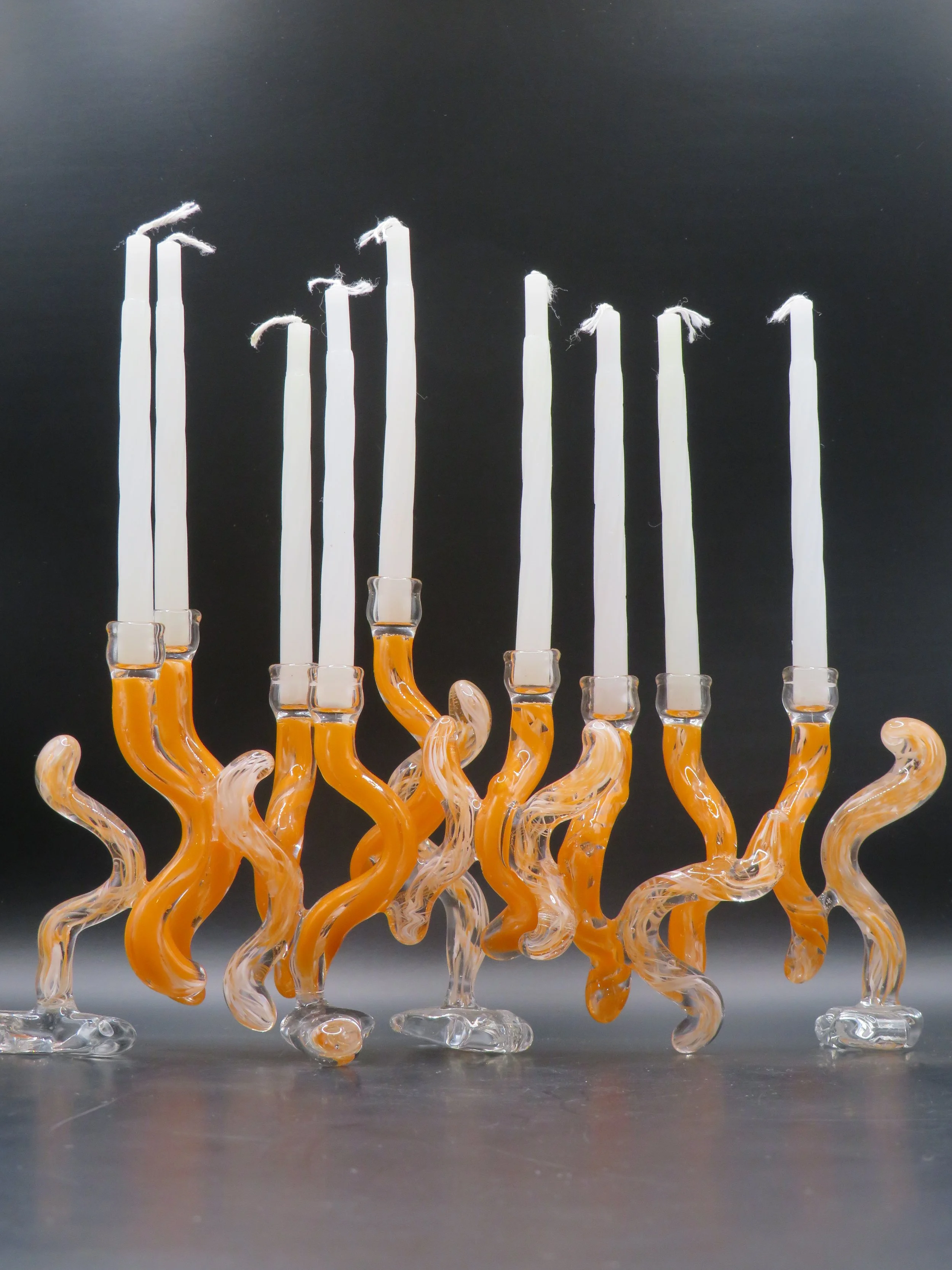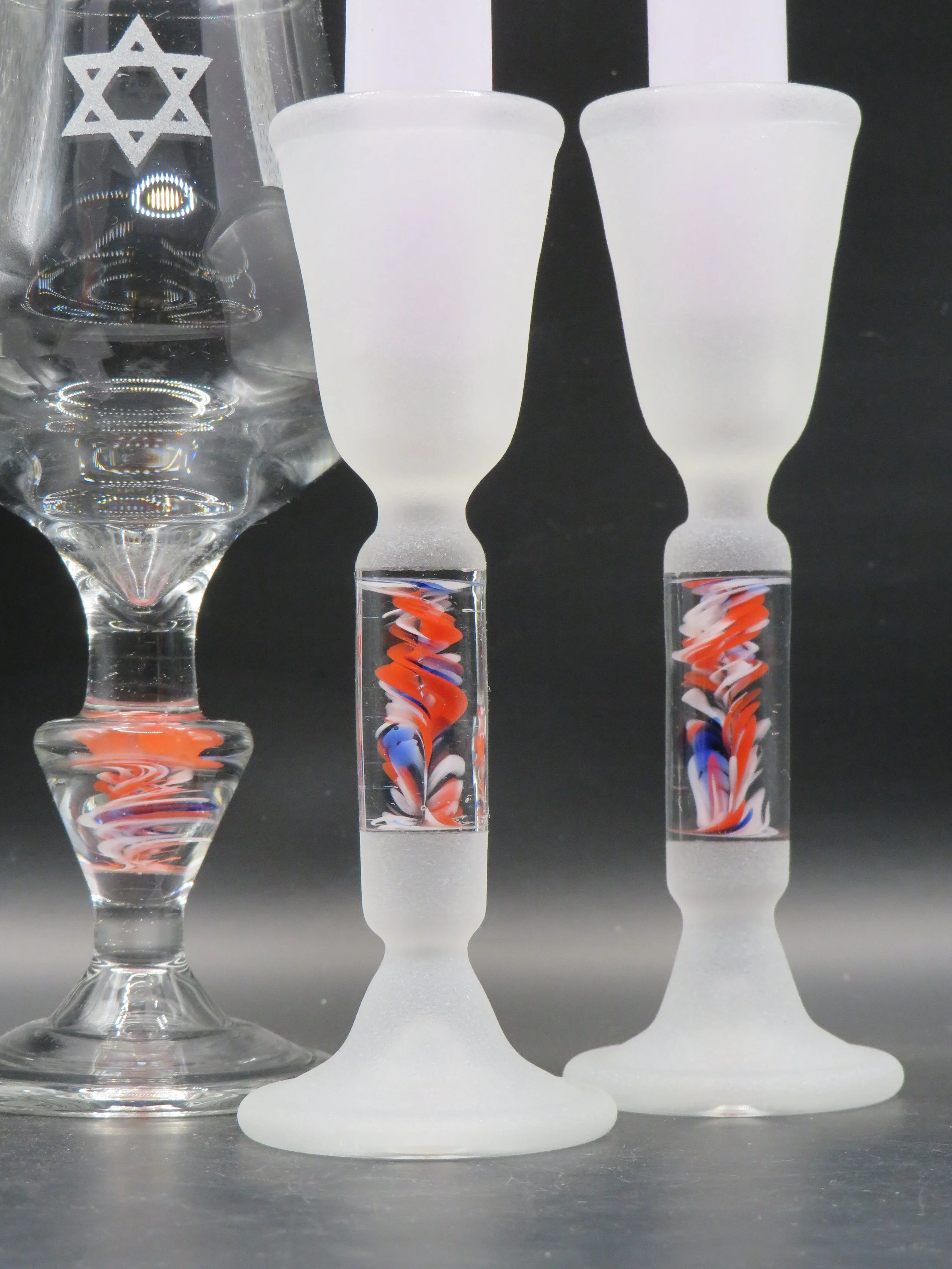 A one-of-a-kind pair of handcrafted candlesticks and a Kiddush cup made from your broken chuppah glass. Perfect for lighting Shabbat candles, sharing meals, and creating lasting memories.